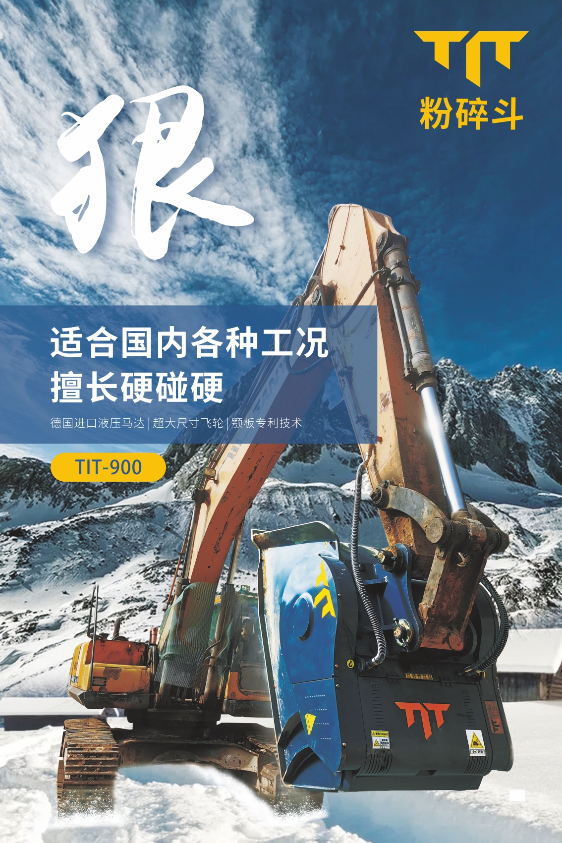 TIT,源自Titan的縮寫,原指古希臘神話中力大無窮的威猛之神,借意本產品剛勁有力,產能高效。TIT粉碎斗,也稱破碎斗,顎式破碎斗,是一款創(chuàng)新型挖掘機屬具,掛于挖掘機大臂上,可快速將工程惰性材料破碎成極具價值的工程用料。隨著國內基建行業(yè)展,基于市場對經濟化、效率化、環(huán)保化材料的大量需求,破碎斗將廣泛應用于多種物料破碎場景。 |